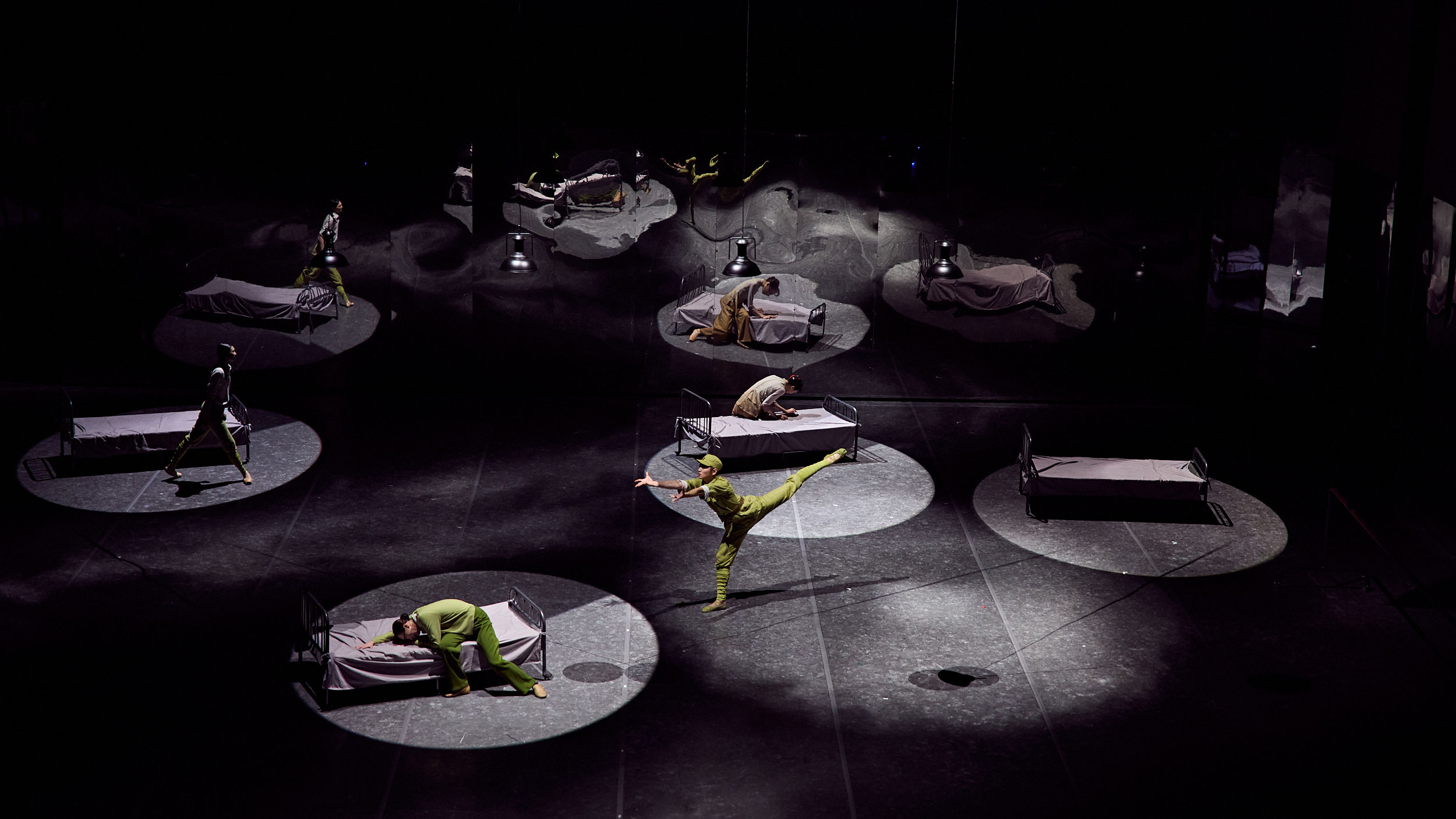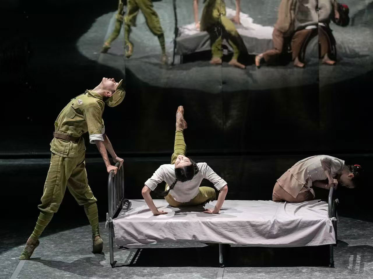 在编导王舸精心构筑的倒叙空间里,舞剧从中年“大姐”的回忆切入,通过交错的现实与记忆空间铺展青春叙事,让现实与回忆交织。“大姐”青年与中年时期的身影在虚实交错的舞台上转换,展现了她一生的关键时刻,以及与通讯员、新媳妇和其他战士之间的情感。轻喜剧般的灵动舞蹈勾勒出军民鱼水情,却在最温柔的瞬间,让观众感受到战争的无情与和平的珍贵。